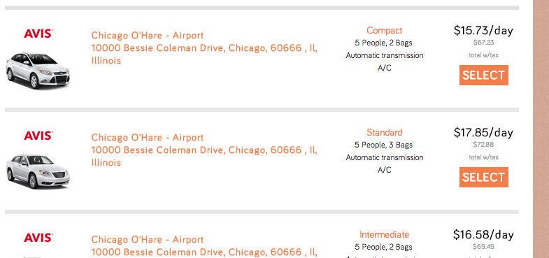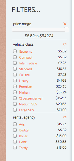 6. You may narrow down the search results by selecting the price range, type of vehicle, and preference for a particular rental car company.